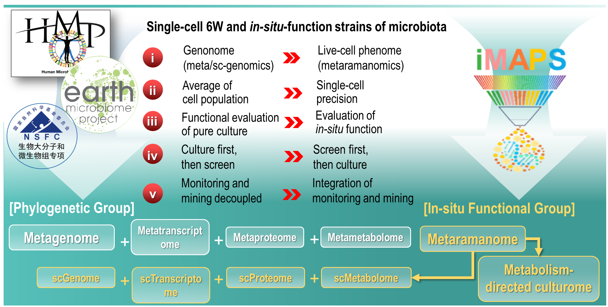 iMAPS introduces the metaramanomics approach, to profile the in-situ metabolic activities of live single-cells from a microbiome, and then directly sort them out for single-cell culture or sequencing, based on high-throughput Raman flow sorters.